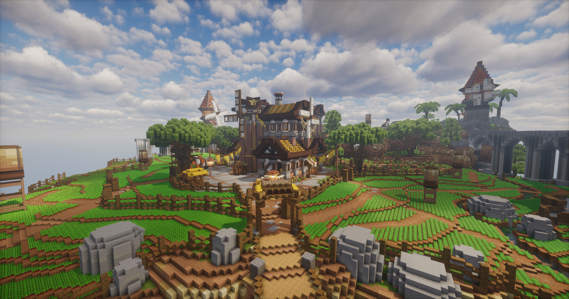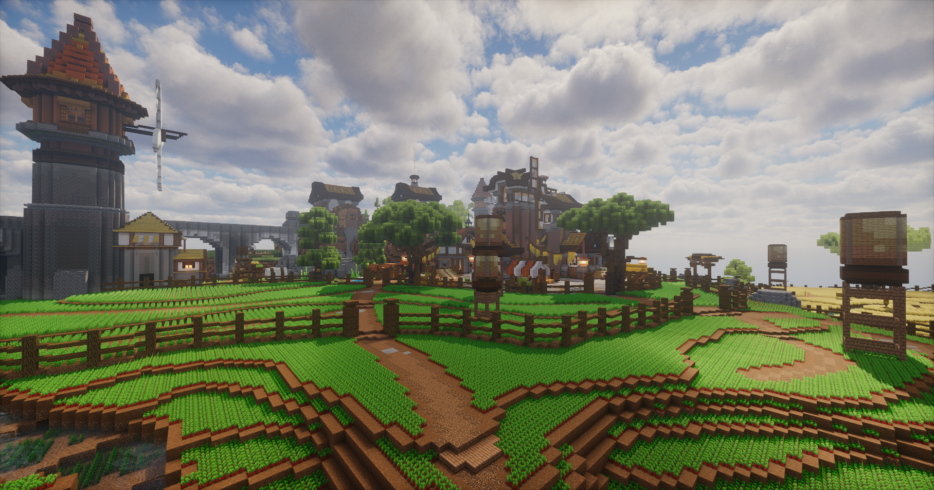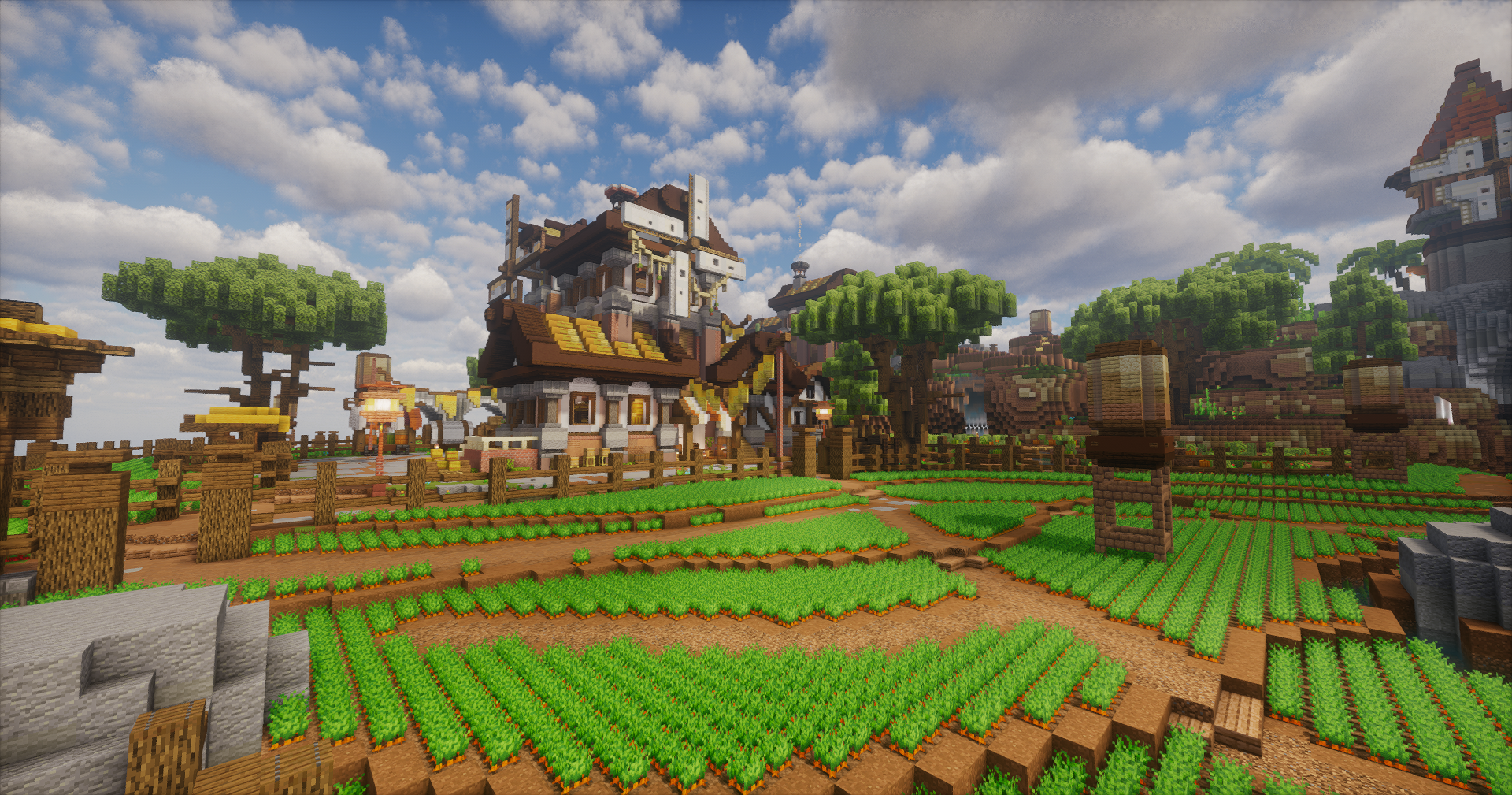 This build features a vibrant and highly detailed farming themed environment, combining lush fields, flowing rivers, elevated terrain, and cozy structures with golden roofs. The landscape blends multiple crop areas, animal zones, and natural elements into a harmonious village-like setting, creating a warm and alive atmosphere ideal for survival, RPG, or skyblock gameplay. Every corner is carefully crafted to feel immersive, functional, and visually stunning.